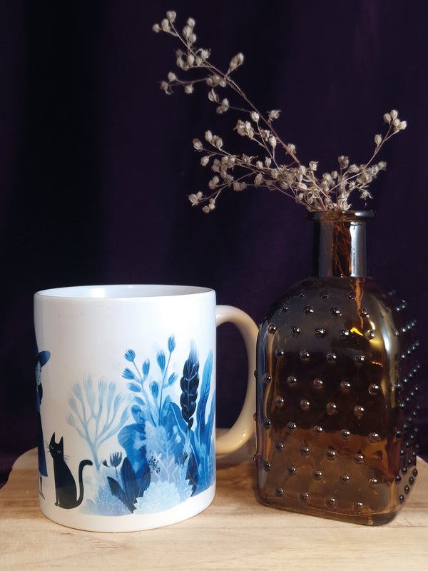 Laat je betoveren door de rust en charme van deze prachtige heksenmok. De illustratie toont een vriendelijke heks met zwarte kat, omringd door planten en mysterieuze vormen. Het design ademt een gevoel van kalmte en magie - perfect voor een moment van ontspanning met je favoriete warme drank.